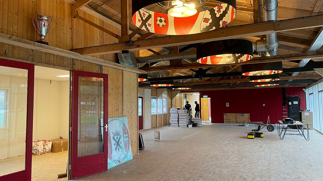 De noodkantine is gebouwd tussen de velden 1 en 2. Aan deze grote klus hebben veel vrijwilligers (‘onze helden’, aldus de Facebookpagina van de club) én sponsorende bedrijven hun bijdrage geleverd.