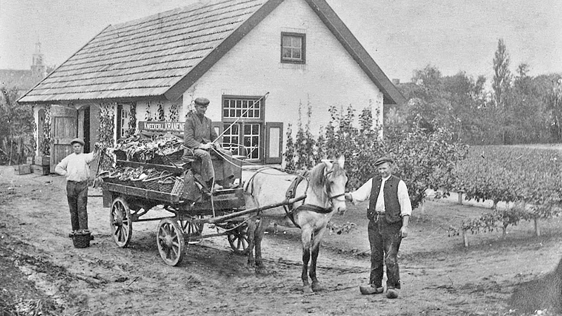 Bovenste foto: Kwekerij Kranenburg aan de Hamseweg, rond het begin van WOII. Louis Blazer staat links op deze afbeelding. Op de bok: Gijs van der Grift. Hendrik van der Coterlet bij het paard (Archief Eemland).