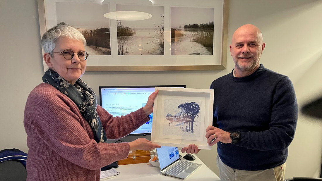 De broer van Henri van Noordenburg -Richard (op bovenste foto rechts)- overhandigde de ingelijste etsen aan Marga Baas, archivaris van de Historische Kring.