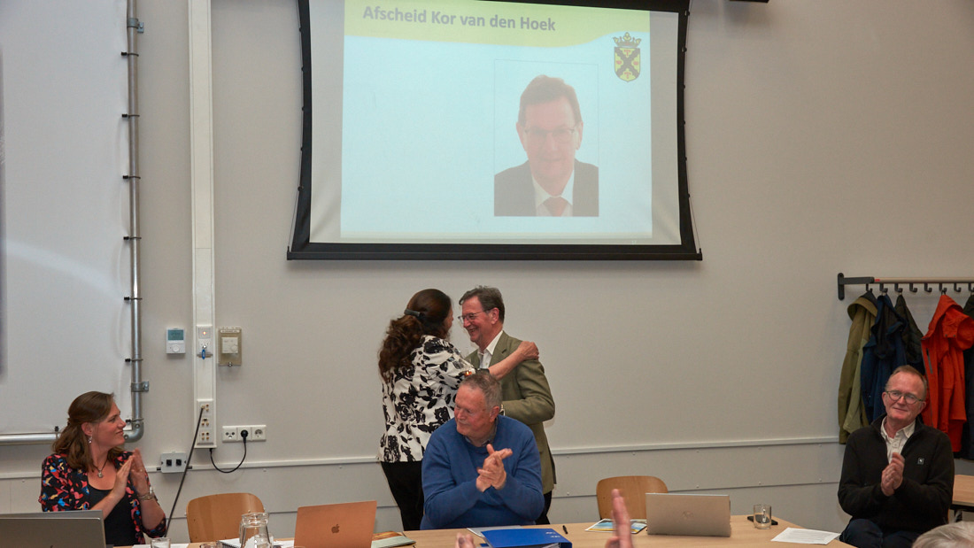 Voorzitter Yvonne van Norden bedankte in een speech bestuurslid Kor van den Hoek voor jarenlange, trouwe dienst. Van Norden sprak warme woorden die vergezeld gingen van een cadeaubon, een fles wijn en een knuffel voor de camera. Kor neemt op eigen verzoek afscheid als bestuurslid. Hij wil graag iets meer ruimte in zijn agenda.