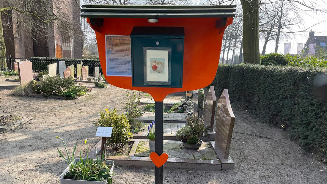 Direct na het toegangshek van Begraafplaats Langenoord in Hoogland staat rechts een brievenbus met ‘Post voor de hemel’. Hiermee kun je ‘van hier naar daar’ een brief sturen aan iemand, die je mist.