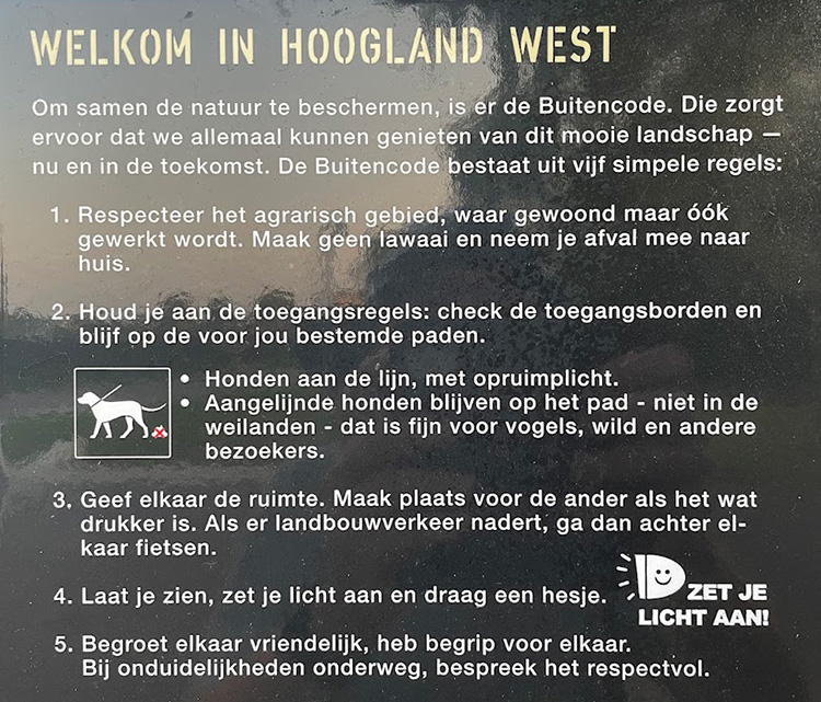 Informatiebord BuitencodeAlle drie borden beginnen met 5 simpele regels om samen de natuur te beschermen. Deze zogenoemde ‘Buitencode’ zorgt ervoor, dat ‘het mooie landschap, nu en in de toekomst behouden blijft’.