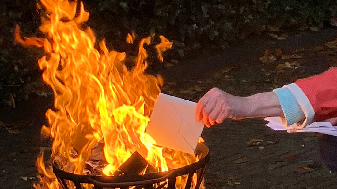 ‘Om vijf uur in de middag hebben we de hemelpost uit de brievenbus gehaald en op het plein vóór de Sint Martinuskerk ongeopend aan het vuur toevertrouwd. Zo konden ze in warmte met de rook opstijgen naar de hemel, naar verder dan voorbij. We waren met een kleine groep van acht mensen waarbij iedere aanwezige een stapeltje brieven met aandacht en zorg in het vuur legde. We lazen een gedicht. Aansluitend hebben we nagepraat onder het genot van warme chocomelk.’