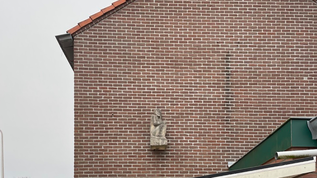 De twee beeldjes op de zijgevels zijn gemaakt door Maarten Mooij (Westzaan 1918 – Soest 1990). Hij was een Amersfoortse kunstschilder en beeldhouwer. Hij maakte figuratieve beelden. Tussen 1949 en 1953 was hij stadsbeeldhouwer van Amersfoort. Hij leidde een veelbewogen bestaan.