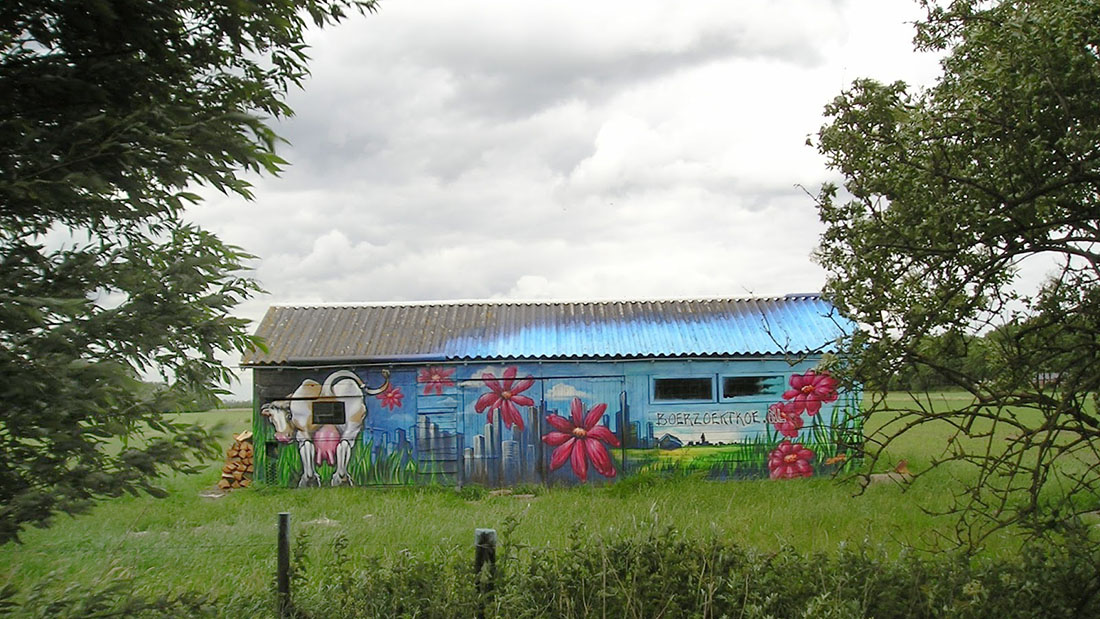 Aan de Slaagseweg in Hoogland-West staat een schuurtje met daarop -nog nauwelijks zichtbaar- wat restanten van een tekening. Jaren geleden was het een kleurrijk kunstwerk (kijk maar op de foto ...